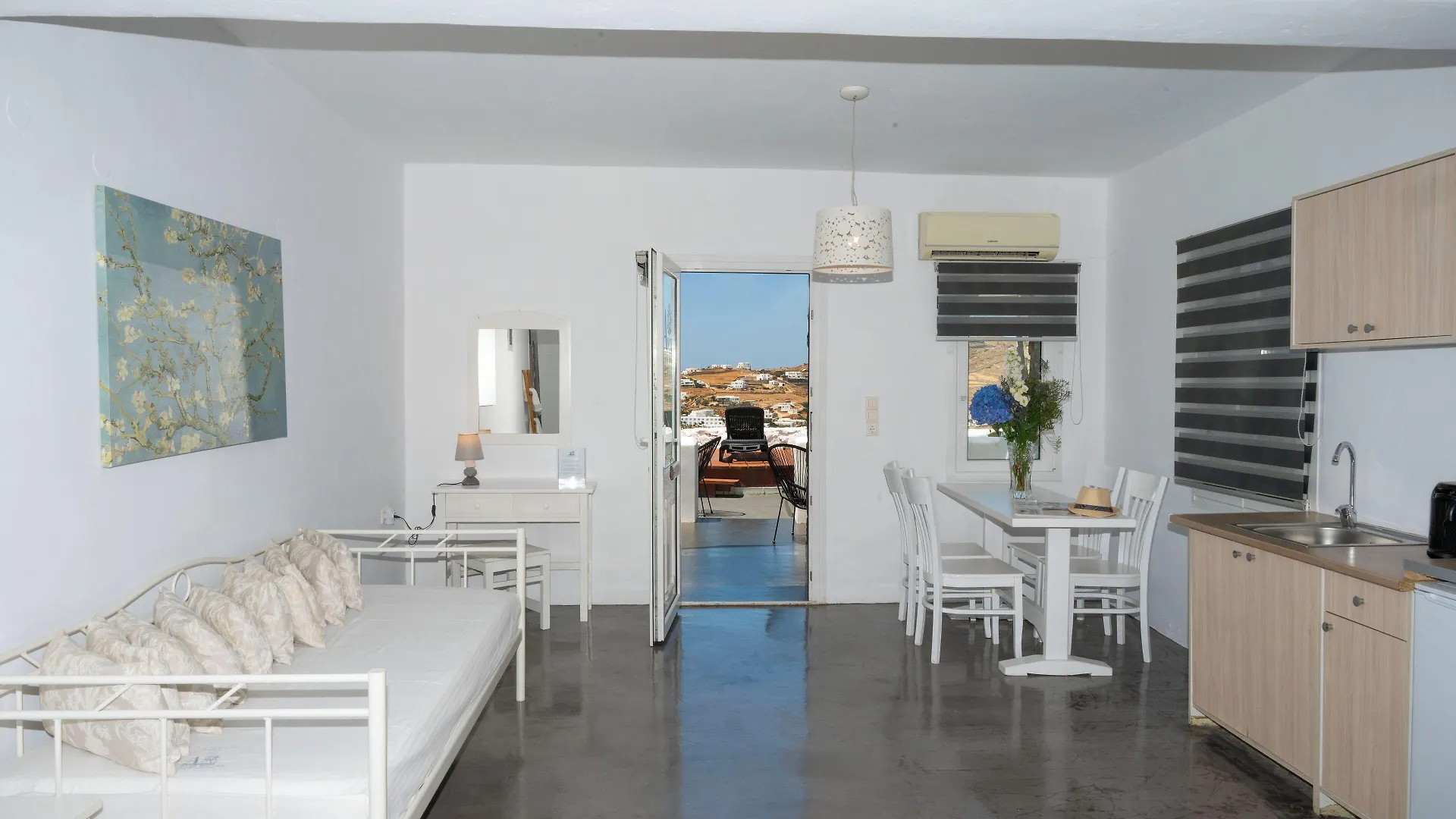 This Ornos property includes a summer terrace and an outdoor swimming pool available for an additional charge.